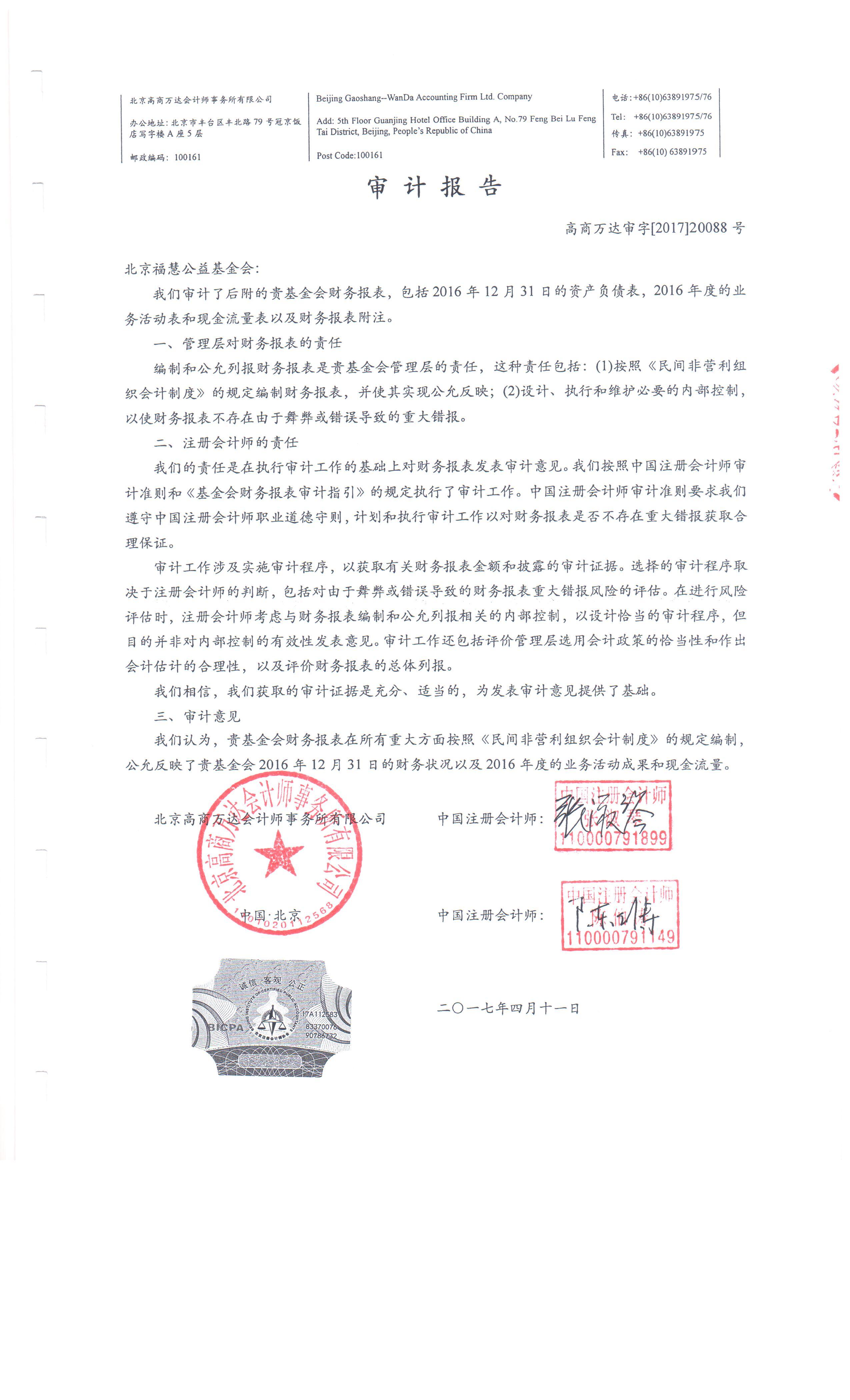 北京福慧公益基金会 2016年度财务审计报告-审计报告-北京福慧公益基金会