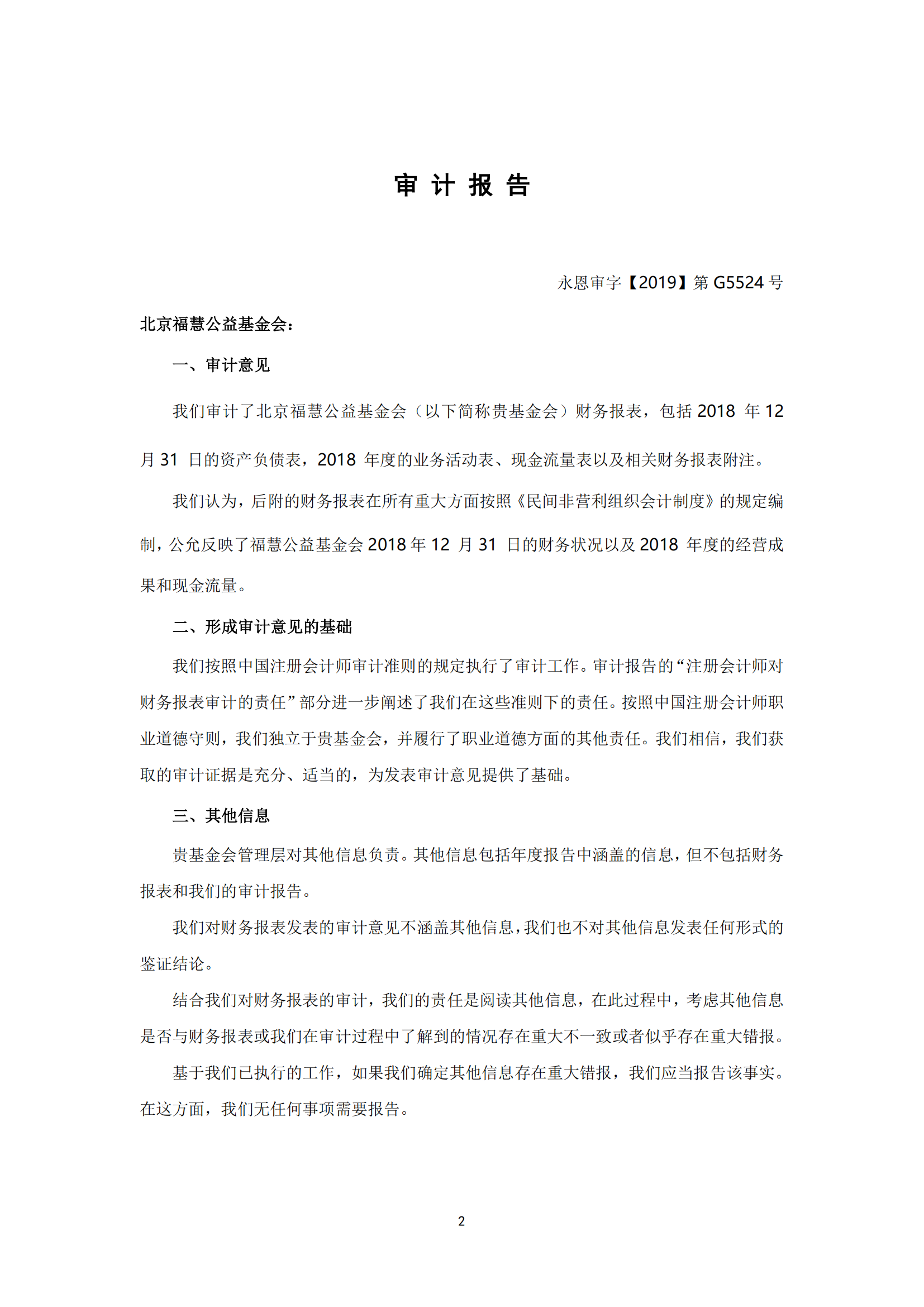 北京福慧公益基金会 2018年度财务审计报告-审计报告-北京福慧公益基金会